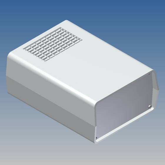Tweedelige behuizing met aluminium front- en achterpaneel. Vierschroef montage. Inwendig voorzien van bevestigingspunten en verticale geleidingssleuven voor montageplaten en/of printplaten. In de bodem en bovendeel is een ventilatierooster aangebracht.