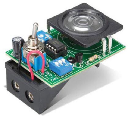 Regelbare snelheid via RV1. Incl. aan/uitschakelaar en luidspreker.