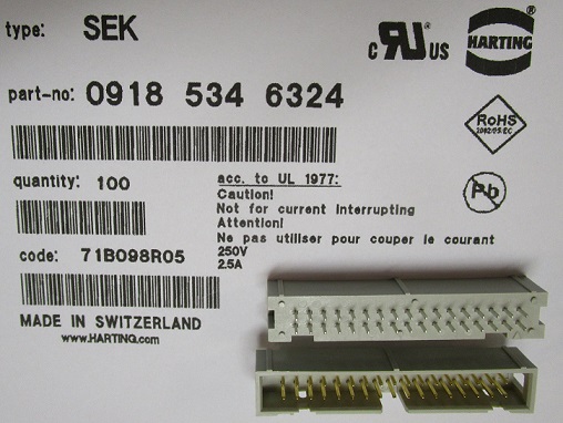 HARTING  0918 534 6324  DIN 41612 Connector, Type 2Q Series, 34 Contacts, Plug, 2.54 mm, 2 Row, a + b