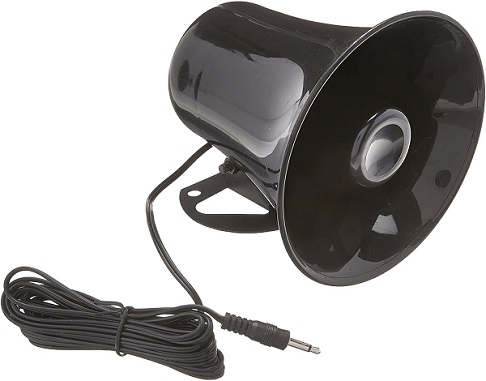 Paging Horn • Diameter: 12,7 cm (5 inch) • Power: 15 Watts Maximum - 8 Watts Normal Power • Impedance: 8 Ohms • Cord: 300 cm (10 feet) with 3.5 mm plug • Includes: Mounting Bracket