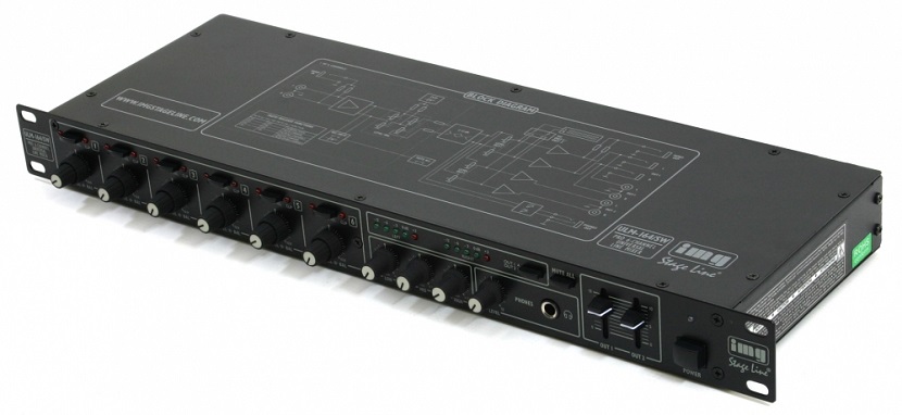 2 stereo-uitgangen, onafhankelijk van elkaar (master 1 via RCA en 6,3 mm jack), 1 mono-uitgang