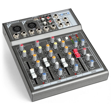 Een 4-kanaals live stage mixer met echo-effect en USB/SD ingang voor MP3-weergave.